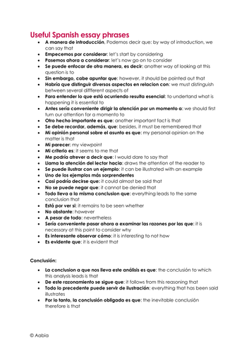 Useful Essay Phrases For A Level Spanish Teaching Resources